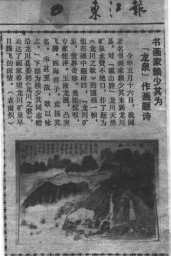 今年五月十六日,我国著名书画家赖少其来到龙川县,对“霍山牌”龙川天然矿泉水赞不绝口,作了题为《龙川之歌》的国画一帧,他在画中题诗曰:[龙川矿泉,世界奇珍。美法惊叹,专家佳评。玉液龙涎,凸突飞腾。四海君子,竞扬其名。幸甚至哉,歌以咏志。]下图为赖少其同志赠于龙川县委的《龙川之歌》,表达了画家希望龙川矿泉早日腾飞的深情。