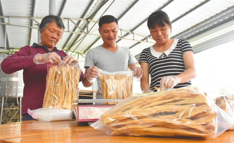 - 脱贫攻坚党旗飘扬。龙川县四都镇新龙村党总支部通过狠抓党员队伍建设,充分发挥党员先锋模范作用,实现融入扶贫抓党建,抓好党建促脱贫,进一步巩固了战斗堡垒,夯实了党建基础,有力有序地推动了脱贫攻坚工作大步向前。郑镇与家人在自家腐竹作坊打包产品。 近日,新龙村党总支部书记黄海增和村里的扶贫工作队照旧来到建档立卡贫困户郑镇家中,详细了解他家近期的生产生活情况。2017年,...